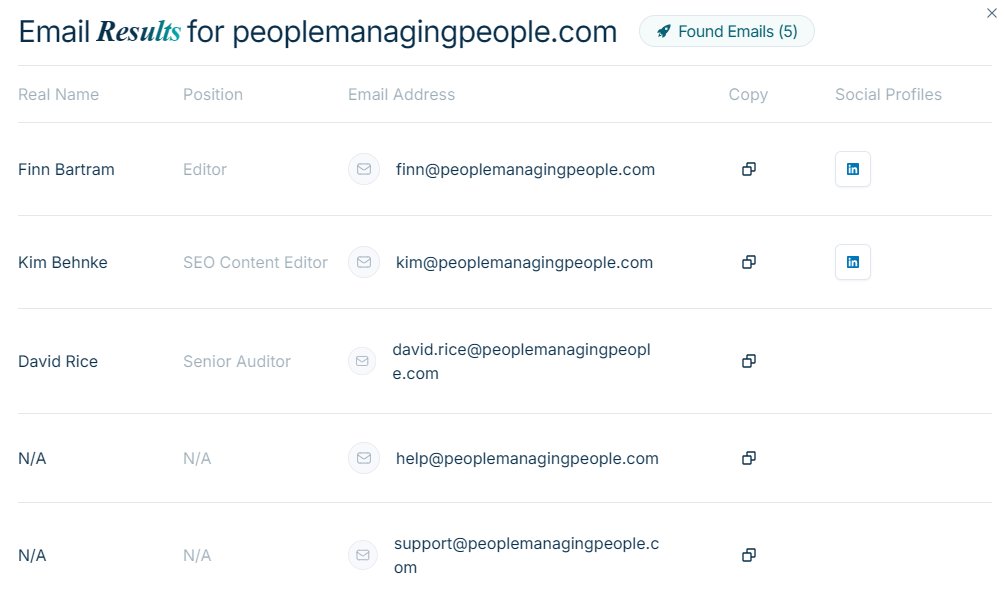 Each result can either be saved or removed from the list. Once you’ve saved a prospect, you can enrich them with verified contact details - name, job description, email address, and social profiles (if available).